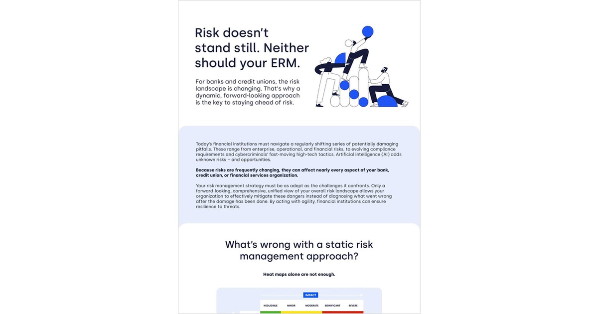 Today’s financial risks evolve too quickly for quarterly assessments. In this infographic, discover how a unified, dynamic approach to enterprise risk management helps banks and credit unions stay ahead of risk by identifying threats before damage occurs.