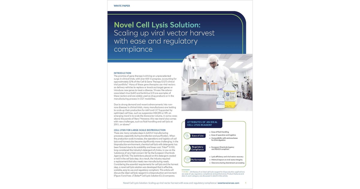 The rapid rise of gene therapy using AAV and LV vectors has created urgent demand for scalable, high-performance bioproduction. A major challenge is cell lysis—where simplicity, compliance, and efficiency must align. With Triton™ X-100 under EU REACH restriction, a next-gen solution is needed. This white paper explores how J.T.Baker® Cell Lysis Solution (CLS) meets critical criteria: ease of use, regulatory compliance, and process performance. With low viscosity, a concentrated format, and endonuclease compatibility, CLS enables efficient lysis and streamlined downstream processing. Data show CLS matches or outperforms Triton X-100 and polysorbate 20 in yield, particle integrity, and clearance.