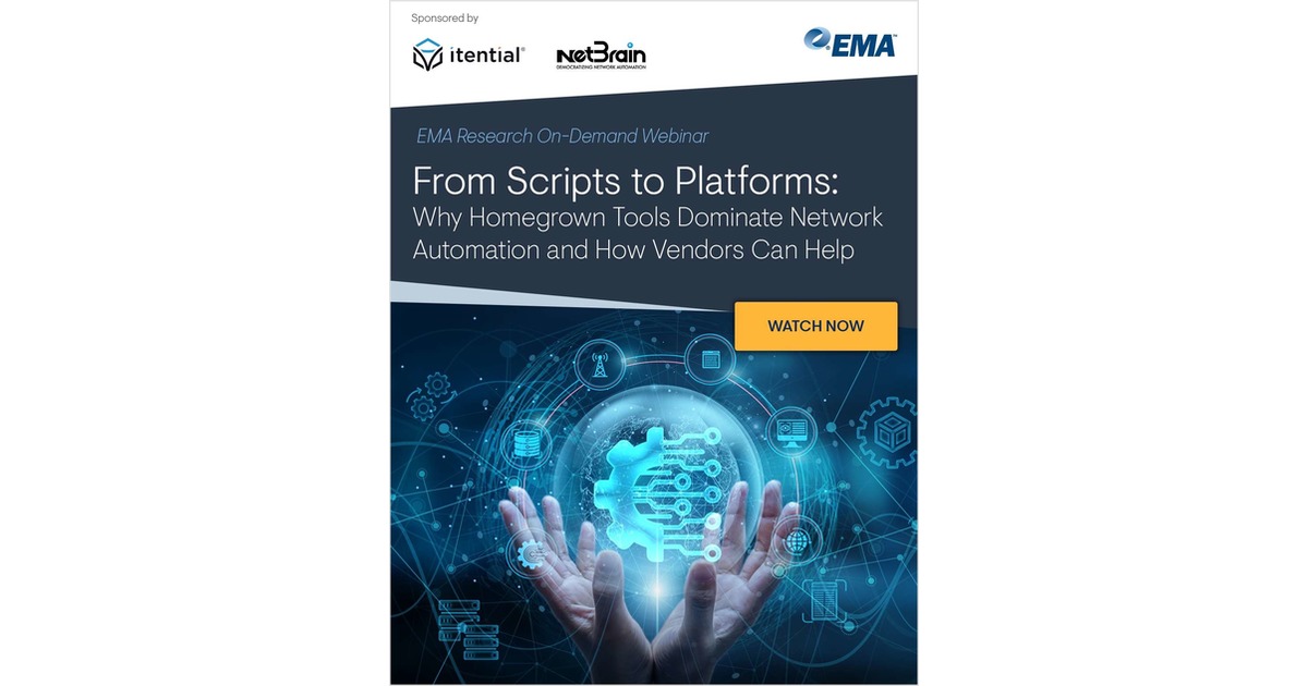 Despite growing pressure to modernize and streamline operations, most enterprise IT organizations are still taking a do-it-yourself (DIY) approach to network automation. According to research from Enterprise Management Associates (EMA), 57% of IT teams rely on open-source tools, and 61% use custom scripts or homegrown software.