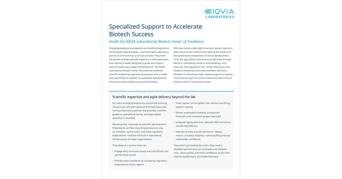 This executive brief from the IQVIA Laboratories Biotech Center of Excellence explores how a purpose-built support model helps biotech sponsors meet critical milestones, avoid costly delays, and navigate the complexities of clinical development with confidence.